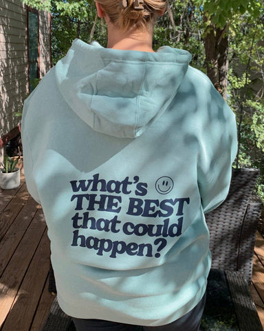 What's The Best That Could Happen Hoodie Words On Sleeve Smiley Women's Hooded Sweatshirts Light Blue Positivity Inspirational Happy Face Trendy Hoodies